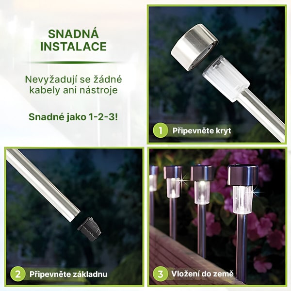 Zažijte bezproblémovou instalaci bez nutnosti kabeláže; jednoduše je zapíchněte do země a užívejte si okamžité osvětlení.